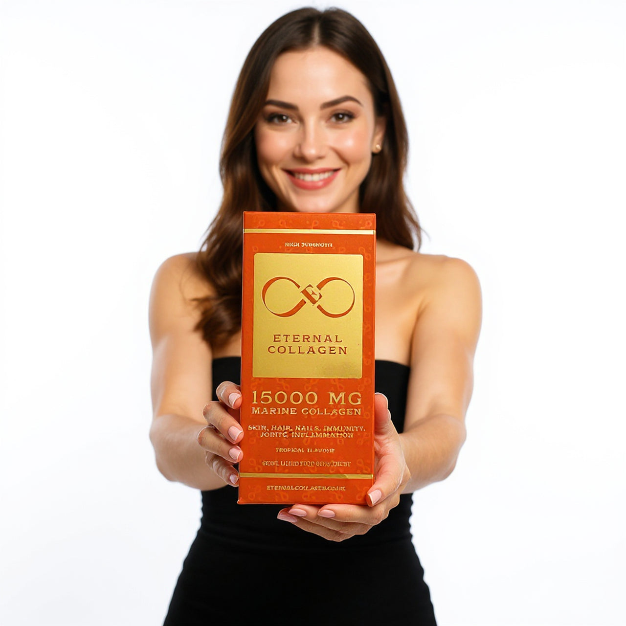 Eternal Collagen 15,000mg Marine Collagen works from within to nourish your body, targeting your complete wellness, beauty, and vitality goals.